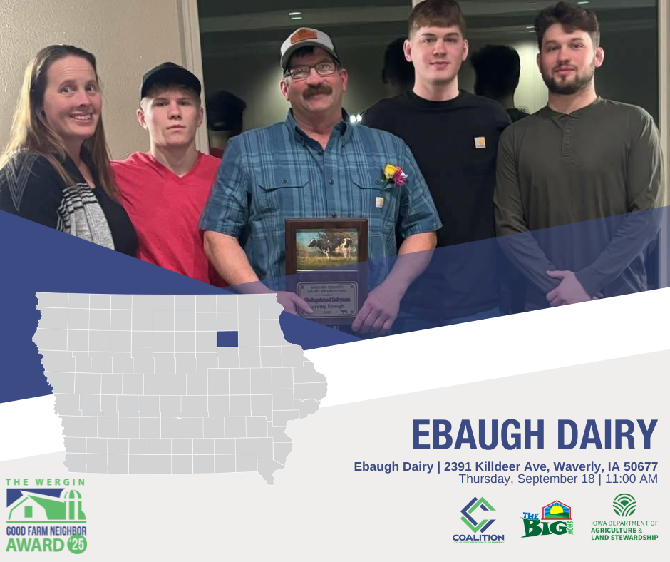 Iowa Secretary of Agriculture Mike Naig will be in Bremer County Thursday to present the Ebaugh family with the Wergin Good Farm Neighbor Award. The Ebaughs, Jeremy and Sara along with their three boys John, Joe, and Jeb, operate a fourth generation farm north of Denver and east of Waverly where they raise Holstein dairy cows, a cow/calf herd, chickens, and sell St. Bernard puppies. They also raise corn, soybeans, hay, oats, and rye. The ceremony will begin this morning at 11 at their farm.